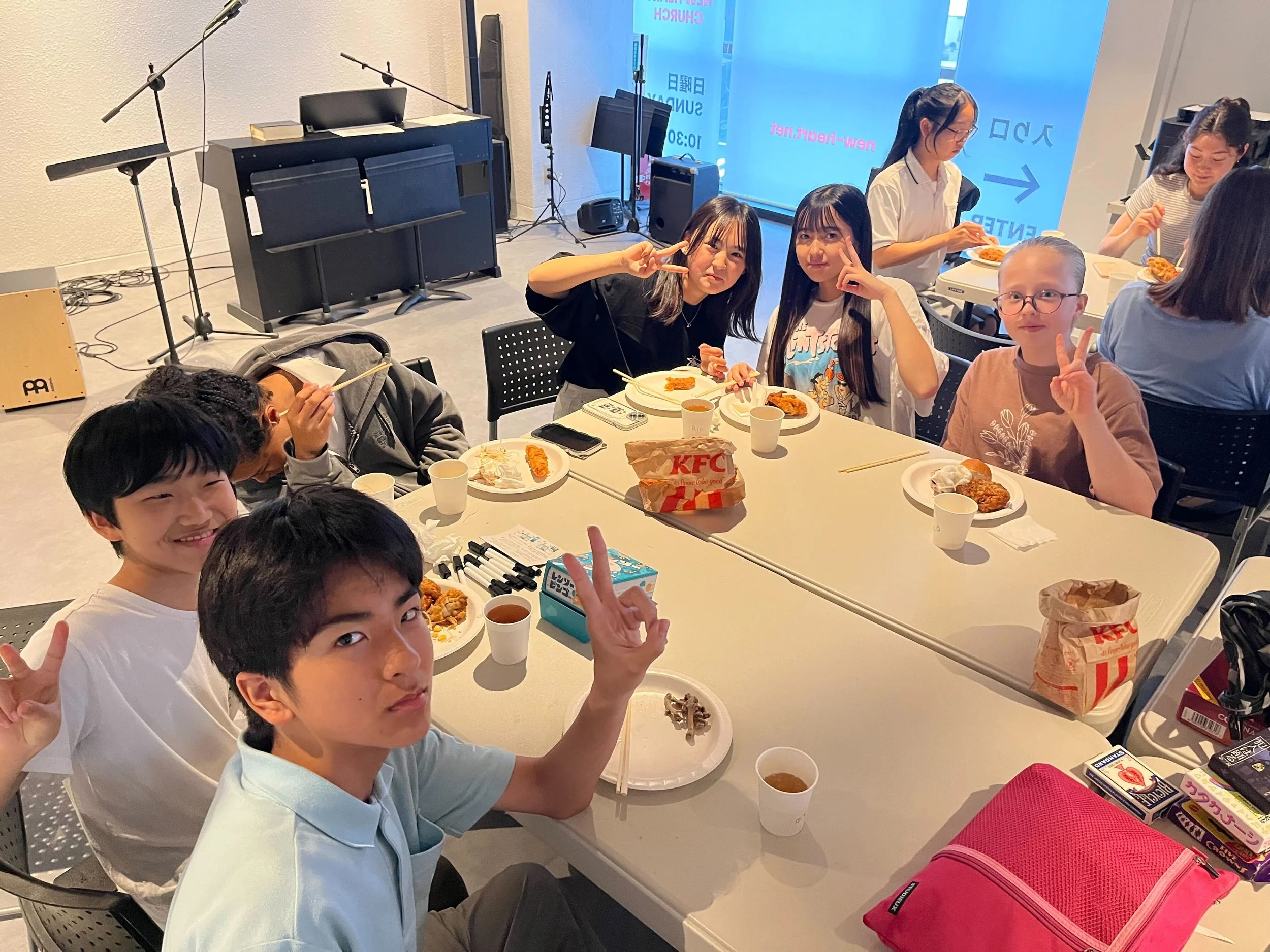 月2回行われる集会ではみんなで一緒にご飯を食べ、ゲームをしてから賛美、メッセージ、分かち合いの時間を持ちます。